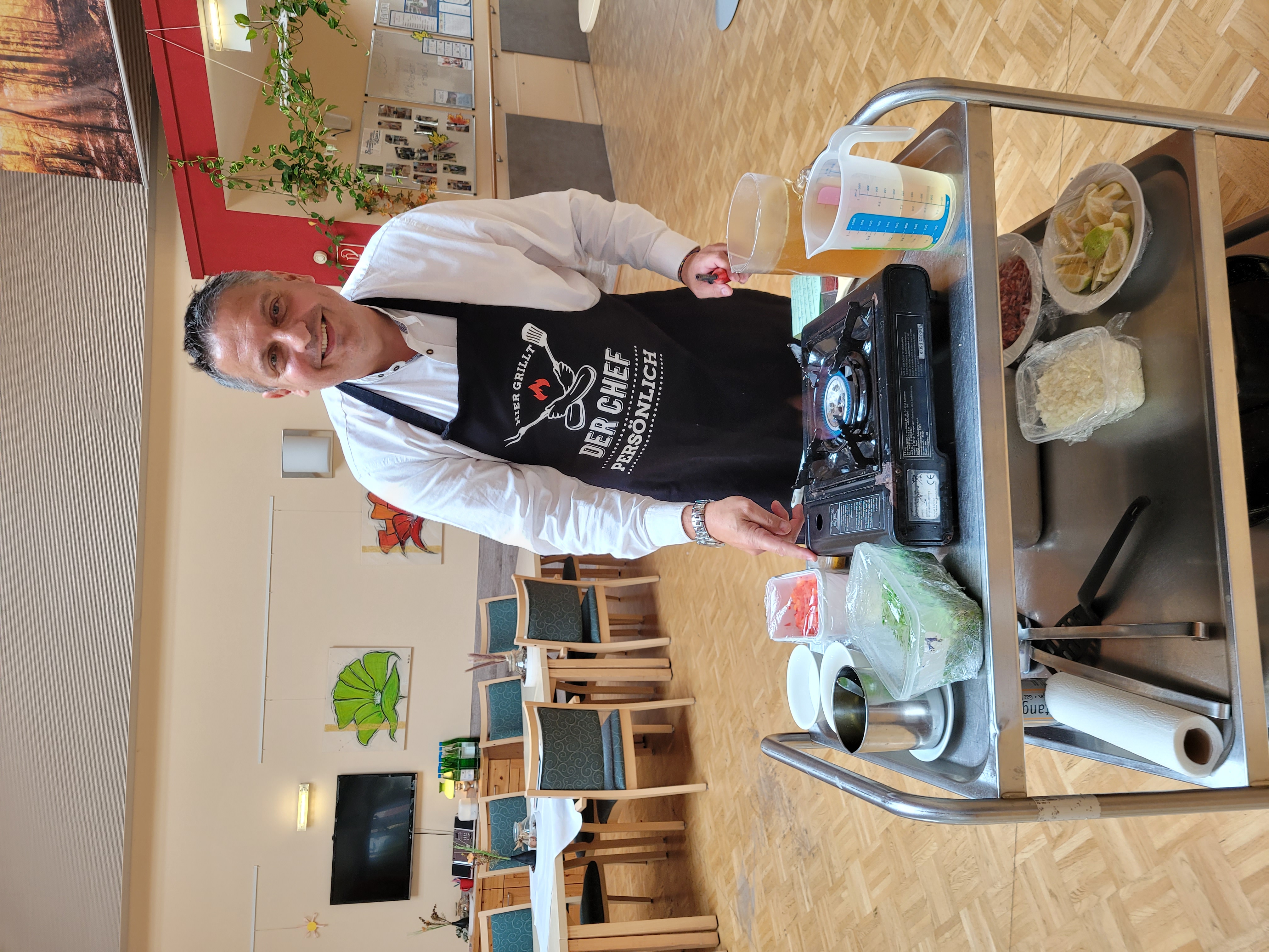 Im Rahmen der Aktion „Herzenswunsch“ hat sich die Bewohnerin des SeneCura Sozialzentrums Rust, Gabriele Frank, eine klassische Paella mit Meeresfrüchten gewünscht. Das hat sich die Hausleitung, Gerald Krenn, nicht zweimal sagen lassen und organisierte alles für die spanische Spezialität. Herr Krenn meinte, dass er die beste Paella macht und wagte sich mit diesen Worten an das köstliche Gericht. Gemeinsam mit Peter König wurde ihm beim Kochen gespannt zugeschaut. Als die Paella fertig war wurde im Anschluss gemeinsam gegessen und ein dazu das ein oder andere Gläschen Wein getrunken. Frau Frank hat sich sehr über die kulinarische Überraschung der Hausleitung gefreut und genoss die leckere Paella in vollen Zügen.