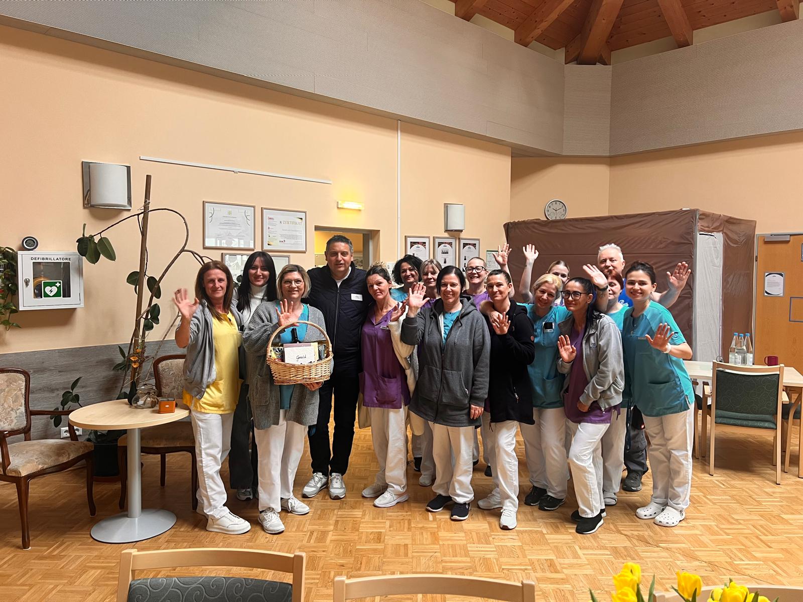 Kürzlich hat das SeneCura Sozialzentrum Rust den langjährigen Hausleiter, Gerald Krenn, verabschiedet. Das Team des Hauses ließ sich wieder so einiges einfallen, um Gerald einen würdigen Abschied zu bescheren. Die Mitarbeiter:innen versammelten sich, um Gerald einen Geschenkskorb voller Köstlichkeiten und einem Brief zu überreichen.